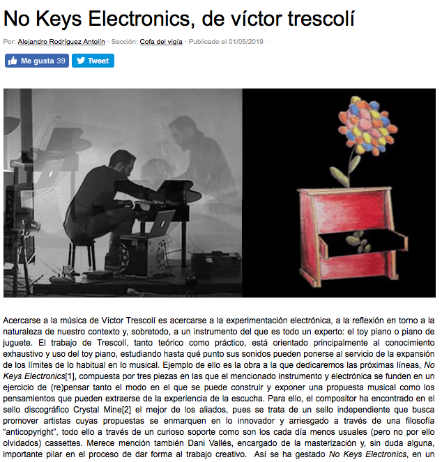 No Keys Electronics . Música por Víctor Trescolí . Diseño gráfico por Víctor Trescolí Sanz . Mezclas y masterización por Dani Vallés . Grabado por Crystal Mine . Burgos – Valencia , 2019 .