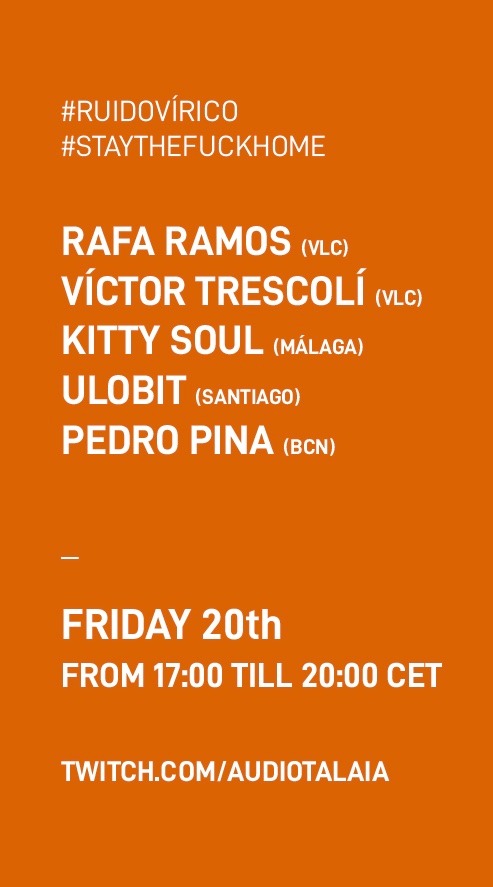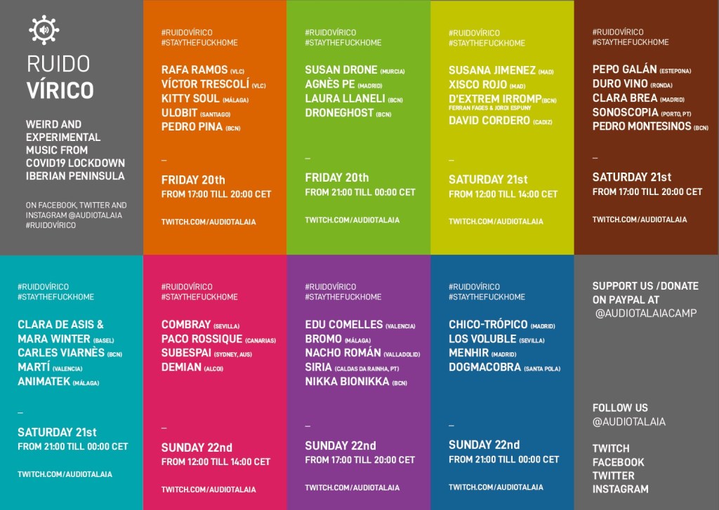 Ruido Vírico es un festival en línea con más de 20 artistas sonoros, músicos electrónicos y videartistas de España y Portugal, que comenzará del 20 al 22 de marzo. Siga el hashtag #RuidoVirico o @audiotalaia en Facebook, Twitter e Instagram.
