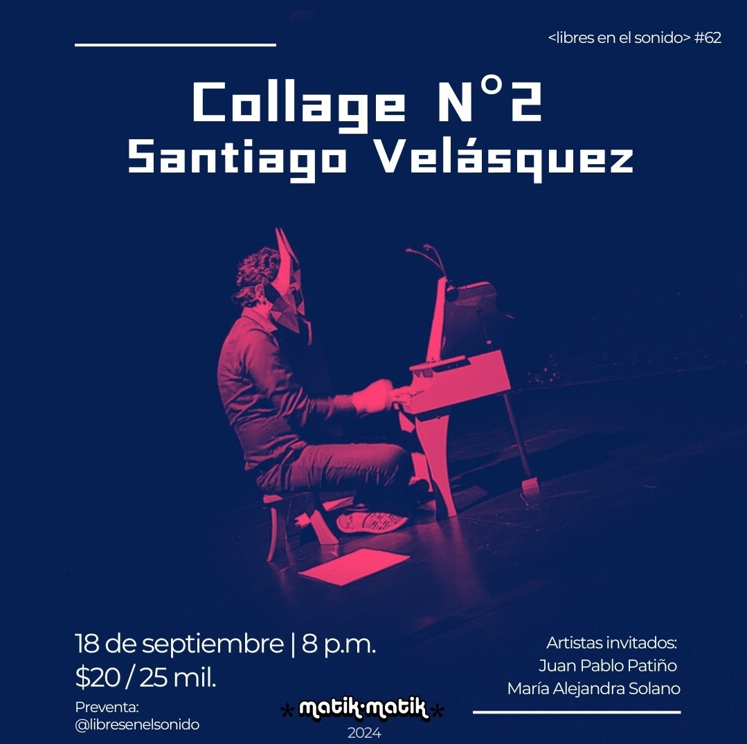 Desde Colombia, Bogotá, el próximo día 18 de septiembre Santiago Velásquez participará interpretando mis obras MUF y Petits Drames para Toy piano y electrónica, en el marco de la franja Libres en el Sonido: Ciclo de música contemporánea y experimental, en homenaje a la compositora Graciela Paraskevaídis en el espacio Matik-Matik, Bogotá.